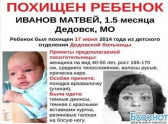 Из детского отделения Подмосковной Дедовской больницы 17 июня около 13:00 похитили полуторамесячного мальчика – Матвея Иванова. Неизвестная женщина вынесла ребенка из медучреждения.